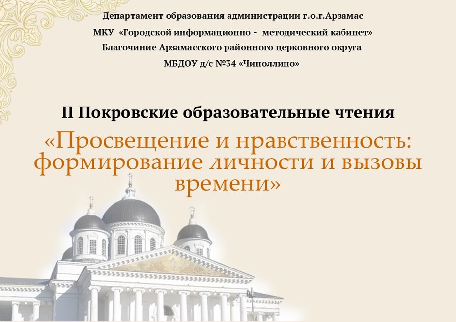 С радостью сообщаем о том, что 27 ноября 2025 года в МБДОУ Детский сад № 34 «Чиполлино» состоялись II ПОКРОВСКИЕ ОБРАЗОВАТЕЛЬНЫЕ ЧТЕНИЯ, которые собрали более 40 слушателей из различных учреждений городского округа город Арзамас и родительской общественности. Почётными участниками мероприятия были протоиерей Лев Бушуев, помощник благочинного Арзамасского церковного районного округа по образованию и катехизации, начальник отдела дошкольного образования департамента образования Болдина Татьяна Викторовна, ведущий специалист городского информационно-методического кабинета Ионова Юлия Константиновна.